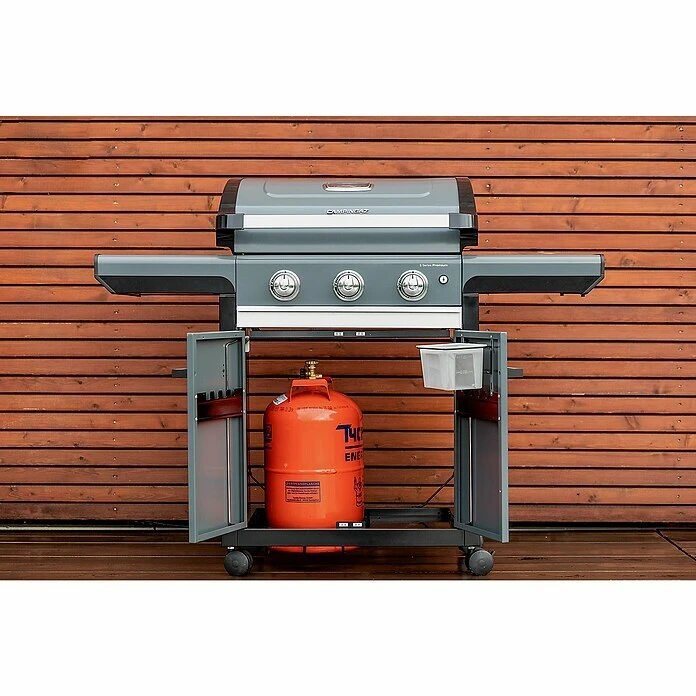 Der Campingaz Gasgrill 3 Series Premium ist ein hochwertiger Gasgrill, der ideal für 4 – 6 Personen geeignet ist. Seine drei Edelstahlbrenner, mit einer Leistung von 10,2 KW, befeuern das 61 x 46 cm große Gusseisen Grillrost, welches die Hitze gut speichert und die typischen Grillmuster auf dem Grillgut hinterlässt. Zusätzlich lassen sich mit dem Grillrost Einsätze des Campingaz Culinary Modular Systems verwenden, sodass noch mehr Gerichte mit dem Grill zubereitet werden können. Außerdem ist in dem Rost bereits ein Brennerschutz integriert, was separate Brennerabdeckungen überflüssig macht und das Aufflammen reduziert. Die beiden Seitentische können als Ablage- oder Arbeitsfläche genutzt werden und sind bei Bedarf abklappbar. So bleibt der Grill kompakt und kann auch auf kleineren Terrassen oder auf Balkonen genutzt werden. Im Unterschrank lassen sich Gasflachen bis zu 11kg Größe unterbringen, die mit dem im Lieferumfang enthaltenen Gasschlauch und Druckregler an den Grill angeschlossen werden können.