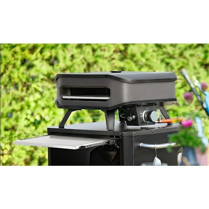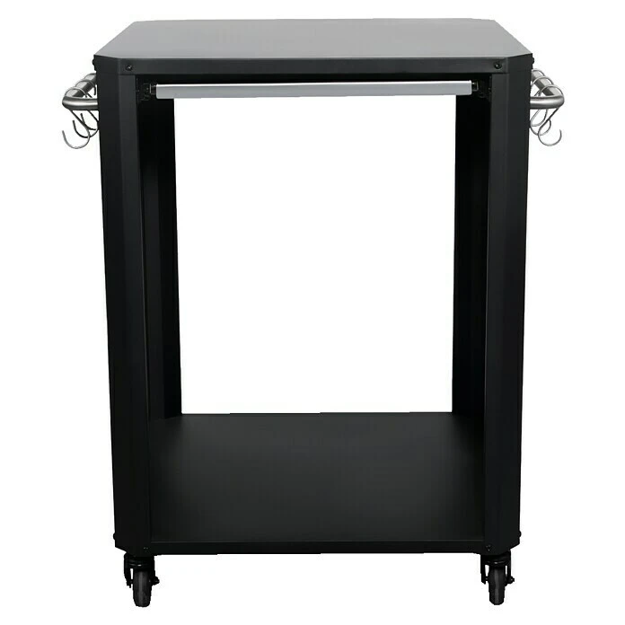 Dieser Unterschrank von Cozze ist geeignet für alle Cozze Pizzaöfen. Der Metallkorpus wurde zusätzlich zu einer Grundverzinkung mattschwarz pulverbeschichtet, sodass er gut gegen Witterungseinflüsse geschützt ist. An den 2 Edelstahlstangen kann das Grillbesteck in Griffweite aufgehangen werden, das ausziehbare Schneidbrett aus Edelstahl bietet zusätzlich Arbeitsfläche. Durch 4 leichtgängige Rollen ist der Unterschrank an verschiedenen Orten einsetzbar.