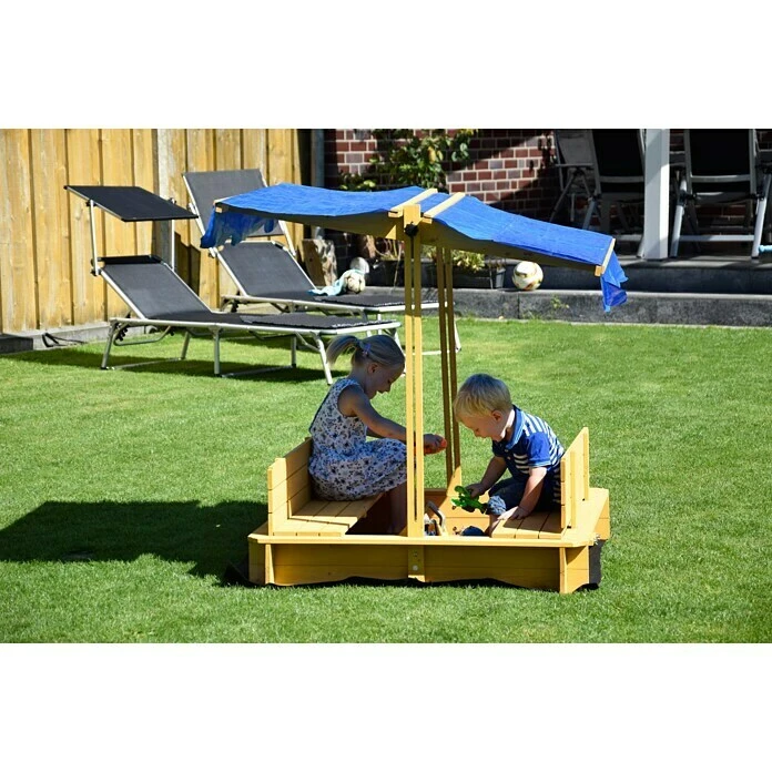 Der Sandkasten von Dobar bietet höchsten Spielspaß für Kinder und kann ganzjährig draußen verwendet werden. Gefertigt aus robustem, wetterfest lasiertem Tannenholz verspricht der Sandkasten einen hohen Schutz gegen äußere Einflüsse sowie eine lange Lebensdauer. Dank des höhenverstellbaren und neigbaren Daches sind die Kinder vor Sonne und Regen geschützt. Außerdem kann das Dach auch vollständig abgesenkt werden und dient so als zusätzlicher Deckel über dem Sand und dem Spielzeug. Der Sandkasten ist mit einer Bodenplane aus Kunststoff und zwei Sitzbänken ausgestattet. Die Rückenlehnen der Sitzbänke lassen sich bei Bedarf einfach abbauen und als Abdeckung für den Sandkasten verwenden.