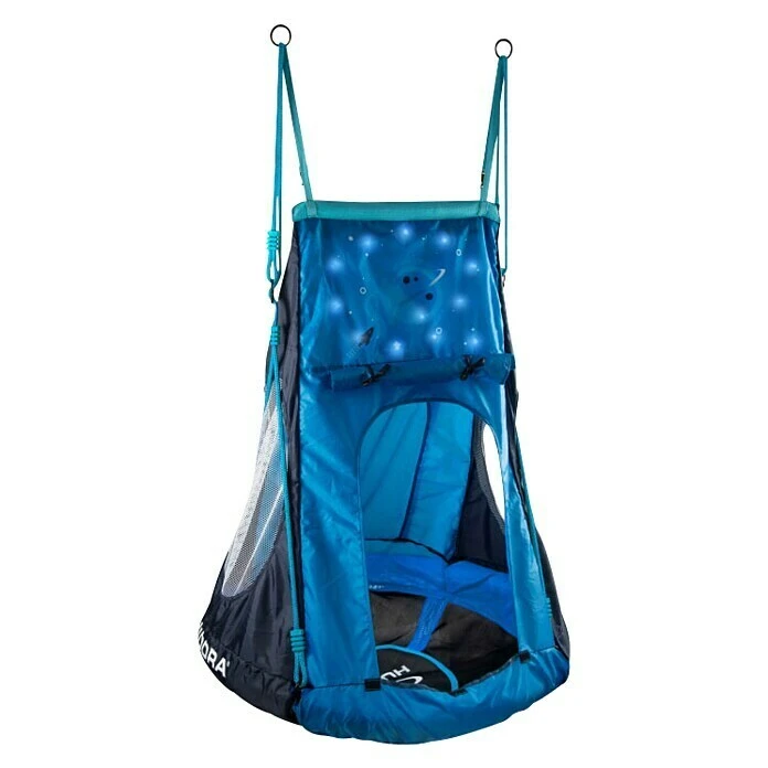 Die Nestschaukel Cosmos LED 90 von Hudora ist eine beleuchtete Schaukel mit Zeltüberzug für das Kinderzimmer. Die Nestschaukel Cosmos eignet sich zum Lesen, zum Schlafen oder zum Kuscheln unter dem durch LED-Lampen nachempfundenen Sternenlicht. Die Effekt- und Innenbeleuchtung der Nestschaukel ist einzeln schaltbar. Die vernähte Verkabelung der beleuchteten Schaukel und das in sich geschlossene Aufhängungssystem machen die Nestschaukel außerdem kindersicher. Das Seil der Nestschaukel ist von 150 bis 200 cm höhenjustierbar, sodass die Kuschelhöhle flexibel für die Kleinen eingestellt werden kann.
