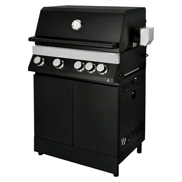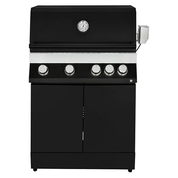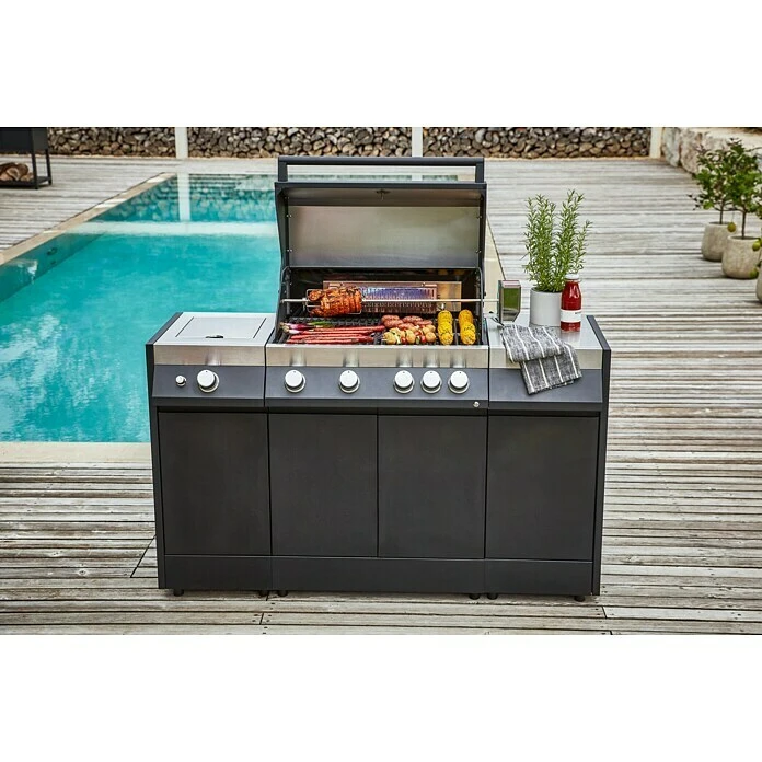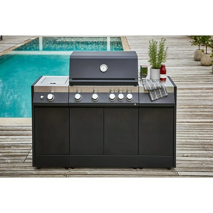 Der doppelwandige Deckel und der Feuerkasten sind emailliert, was eine besonders leichte Reinigung ermöglicht. Die 6 Brenner sowie die Flammenverteiler sind aus Edelstahl gefertigt und somit ebenfalls leicht zu Reinigen. Zur einfachen Bedienbarkeit des Grills tragen die Aluminium Drehregler bei. Im Unterschrank ist neben der Gasflasche auch Platz für weiteres Zubehör. Dank der höhenverstellbaren Füße lässt ich der Grill einfach ausrichten und an weitere Grillküchenmodule anpassen.