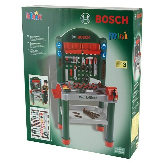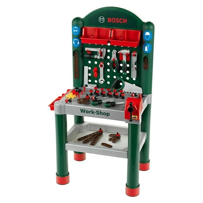 Der Klein Bosch Work-Shop ist für kleine Kinder ab 3 Jahren geeignet und lässt Kinder Einblicke in die Welt der Erwachsenen werfen. Der Work-Shop ist mit kindergerechten und Werkzeugen ausgestattet und lädt kleine Handwerker zum Zusammenschrauben ein. Die griffigen Werkzeuge lassen sich super einfach an der Rückwand aufhängen oder in der unteren Arbeitsplatte ablegen. Die standsichere Workstation enthält eine große Arbeitsplatte mit Lernfunktion für kleine Baumeister. Dank dem zahlreichen Zubehör wie Hammer, Zange, Schrauben, Muttern, Akkuschrauber, Säge, Helm und Vielem mehr, bereitet das Hantieren, Drehen und Hämmern umso mehr Freude. Der beeindruckende Work-Shop sorgt für langanhaltenden Spaß.