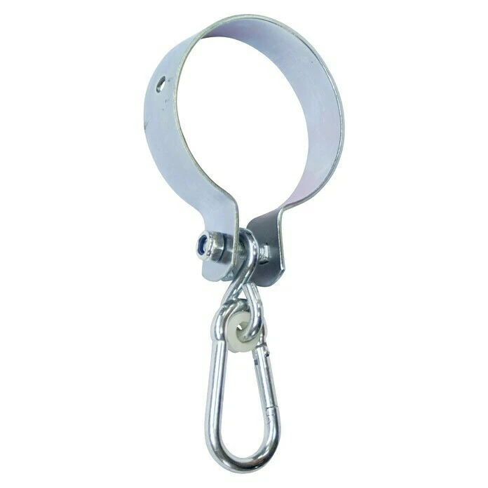 Der Manschettenhaken mit Karabinerhaken ist passend für Schaukelbalken mit einem Durchmesser von 10 cm. Gefertigt aus verzinktem Metall ist der Manschettenhaken stabil und ideal geeignet für die Befestigung von Schaukelsitzen.
