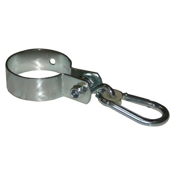Der Manschettenhaken mit Karabinerhaken ist passend für Schaukelbalken mit einem Durchmesser von 8 cm. Gefertigt aus verzinktem Metall ist der Manschettenhaken stabil und ideal geeignet für die Befestigung von Schaukelsitzen.