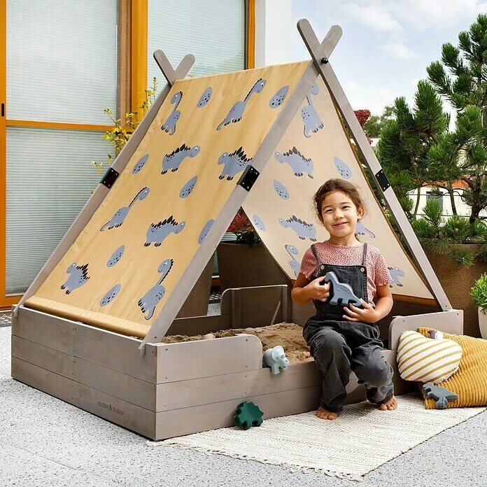 Mit dem Muddy Buddy Sandkasten Dino Lover kann sich jedes Kind sein eigenes Dino-Reich gestalten. Unter dem gemütlichen Zeltdach, welches als Sonnenschutz dient, kann man viele Abenteuer mit seinen Dino-Freuden erleben. Das Stoffzelt lässt sich einfach abnehmen und kann auch separat als behaglicher Rückzugsort genutzt werden. Der geräumige Sandkasten viel Platz zum Buddeln – auch für mehrere Kinder. Der Sandkasten wird mit Sandkastenvlies und einer Abdeckplane geliefert.