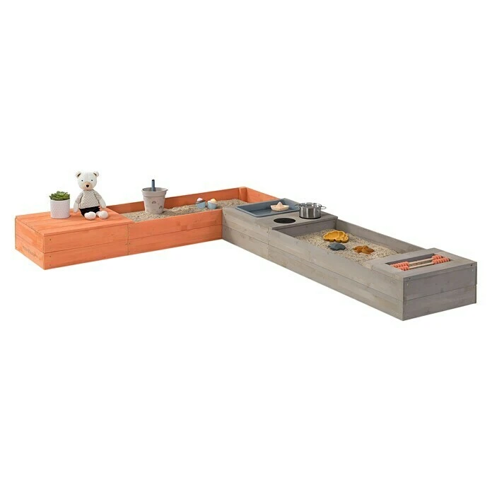 Der ansprechende Sandkasten Flexy Style von Muddy Buddy mit zwei flexiblen Elementen passt sich perfekt allen Gegebenheiten an und kann beliebig im Garten platziert werden z.B. nebeneinander, hintereinander oder über Eck.