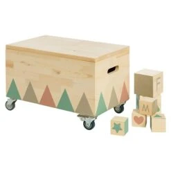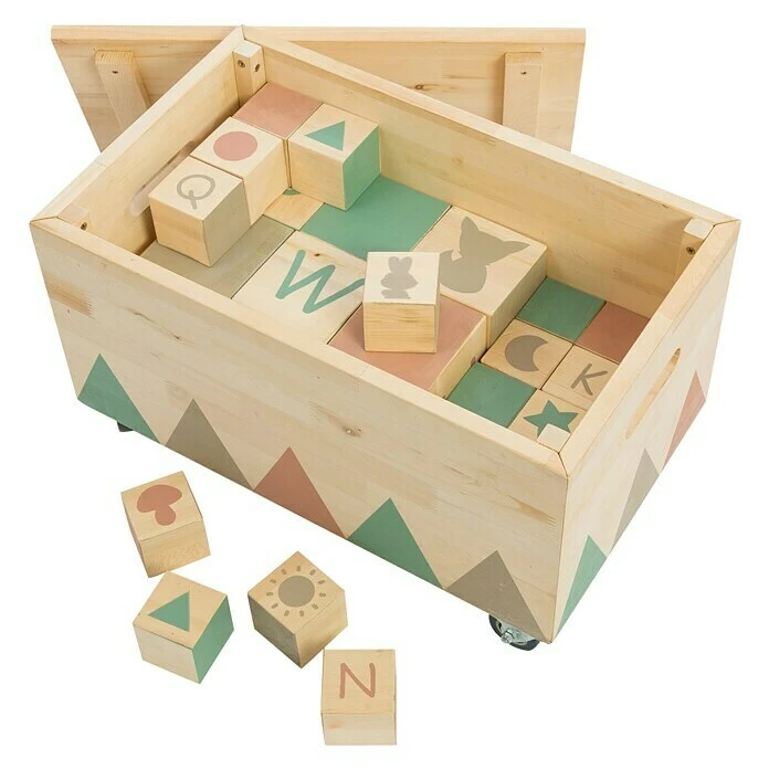 Die Outdoor Spielzeugkiste Treasure Hunter von Muddy Buddy® ist eine robuste Spieltruhe mit 26 Holzwürfeln für den Außen- und Innenbereich. Sowohl die Spielzeugkiste als auch die Holzwürfel sind aus massivem Zypressenholz gefertigt. Die Holztruhe hat einen abnehmbaren Deckel und ist mit einem modernen Dreiecksprint gestaltet. Für den einfachen Transport der Kiste sorgen seitliche Grifflöcher und vier hochwertige Räder mit Feststellmöglichkeit. Da die Holzkiste ein Maximalgewicht von 30 kg aushält, eignet sich diese auch optimal als Sitzbank. Die Spielwürfel bieten eine Vielzahl an Spielmöglichkeiten. Die Holzwürfel gibt es in zwei Größen – 6 große Würfel mit den Maßen 10 x 10 x 10 cm und 20 mittlere Würfel mit den Maßen 6 x 6 x 6 cm. Alle Holzwürfel sind bedruckt mit je einem Buchstaben des Alphabets und diversen anderen Motiven wie etwa Stern, Herz, Tiere etc. Mit den Holzwürfeln können Türme und Figuren gebaut werden oder spielerisch das ABC erlernt werden. Das Holz ist nicht mit Holzschutz vorbehandelt. Die Lieferung erfolgt ohne Dekoration.