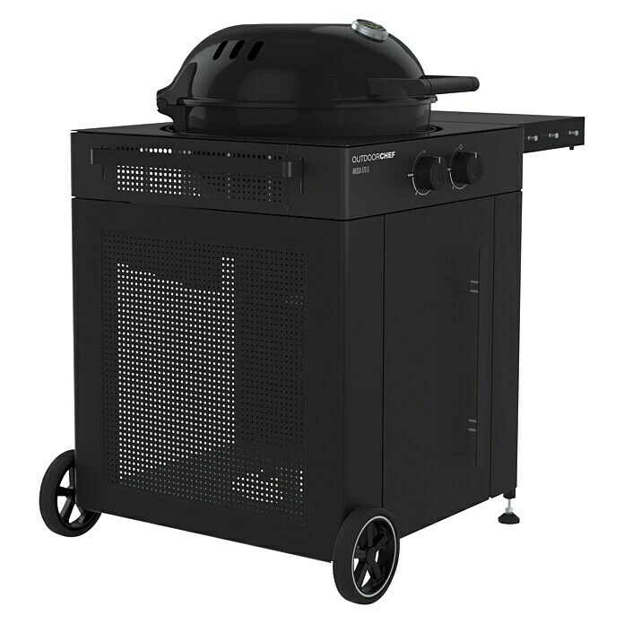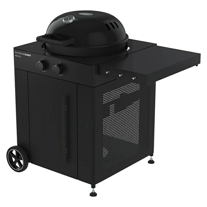 Der Outdoorchef Gaskugelgrill Arosa 570 G „Limited Edition“ verwandelt jeden Garten im Handumdrehen in einen Ort für eine Grillparty mit Familie und Freunden und überzeugt dabei mit seinem modernen, minimalistischen Design. Mit einem Grillrostdurchmesser von 54 cm können mühelos 6 bis 8 Personen und mehr verköstigt werden. Der hochwertige Grill steht auf einem stabilen, schwarzen Metallunterschrank, in dem auch gleichzeitig die Gasflasche gelagert werden kann. Durch seine 2 Rollen ist der Grill im gesamten Garten einsetzbar. Klappt man den arretierbaren Seitentisch aus, wächst der Grill von 85,5 cm Breite auf 113 cm Breite, sodass 27,5 cm Arbeitsfläche gewonnen werden. Dank seiner 2 Edelstahl Ringbrenner mit insgesamt 9,5 KW Brennerleistung und dem Outdoorchef Trichtersystem ist eine gleichmäßige Hitzeverteilung garantiert und es können Spitzentemperaturen von 500°C erreicht werden. Temperaturen von 80 – 360°C können, dank der Gourmet Burner Technology, sogar lückenlos eingestellt werden. Zudem sorgt das Flame Guard System dafür, dass die Brenner auch bei windigen Umgebungen nicht ausgehen. Perfekt also für Grillgut, das eine konstante Temperatur über einen langen Zeitraum benötigt. Ein weiteres Sicherheitsfeature ist das Safety Light, durch das die Drehregler beleuchtet werden, sobald sie aufgedreht sind. So hat man jederzeit im Blick, ob das Ventil offen oder geschlossen ist. Abgerundet wird der Grill durch praktische Zusatzfunktionen wie dem seitlichen Handtuchhalter und den Besteckhalterungen am Seitentisch. So ausgestattet steht der nächsten Grillparty nichts mehr im Weg.