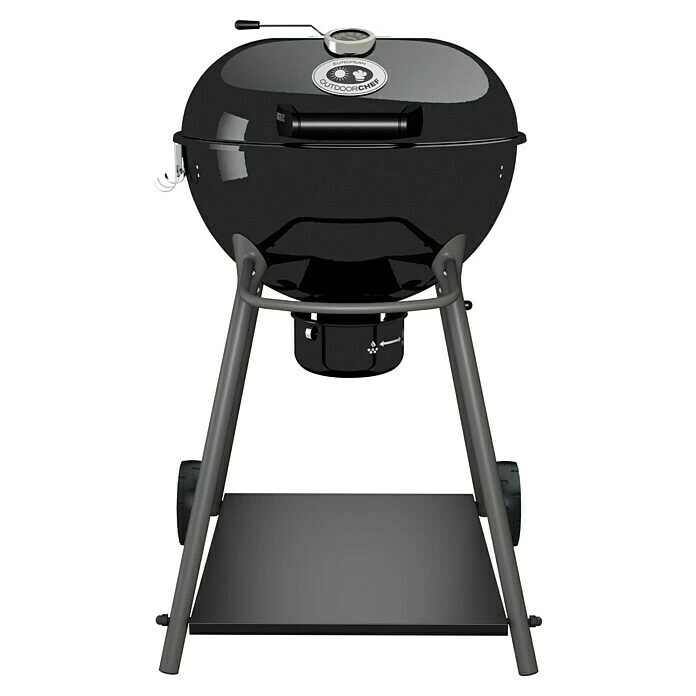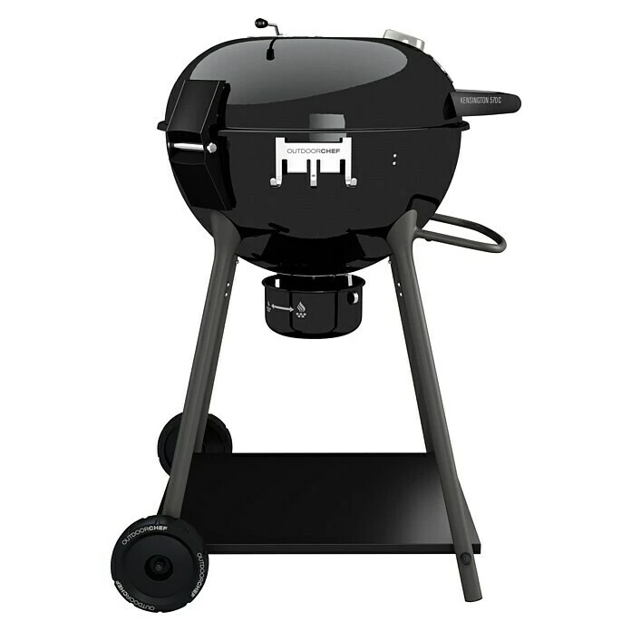 Der Kensington 570C Holzkohlegrill von Outdoorchef verwandelt jeden Garten im Handumdrehen in einen Ort für eine Grillparty mit Familie und Freunden. Mit einem Grillrostdurchmesser von 54 cm können mühelos 6 bis 8 Personen und mehr verköstigt werden. Der hochwertige, elegant schwarz lackierte Grill steht auf einem stabilen Metallgestell und ist durch 2 Rollen im gesamten Garten einsetzbar. Zudem weist er das einzigartige EASY SLIDE Trichtersystem auf. Dank diesem System kann bis zu 100% der Grillfläche indirekt genutzt werden. Der Edelstahl-Kohlebehälter ermöglicht schnelles Anfeuern und geringen Kohle-/Brikettverlust während des Grillens. Die Hitzesteuerung erfolgt über die beiden Ventilationsöffnungen oben und unten. Das integrierte Deckelscharnier bietet optimalen Komfort und die Bodenablage Platz für Zubehör. Durch die angenehme Arbeitshöhe von 83 cm ist selbst längeres Grillen problemlos und rückenschonend möglich. Zudem verfügt der Kensington 570C über einen Ascheauffangbehälter, was die Reinigung deutlich erleichtert.
