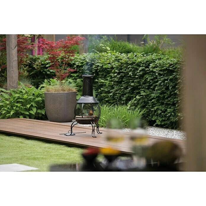 Der formschöne Gartenkamin Sauda von RedFire eignet sich ideal als Wärmequelle für kühlere Sommer- oder Herbstabende. Er ist komplett aus robustem Stahl gefertigt und macht in jedem Garten und auf jeder Terrasse ein gute Figur. Durch die Funkenschutzgitter ist die Umgebung des Kamins vor Funken geschützt ohne auf die Atmosphäre von lodernden und knisternden Holz zu verzichten. Mit dem, im Lieferumfang enthaltenen, Schürhaken kann die Glut und das Flammenspiel kontrolliert werden, sodass das Holz vollständig verbrennt. Zum Befeuern sollte nur trockenes, sauberes Brennholz verwendet werden, da es sauberer mit weniger Rauchentwicklung verbrennt.