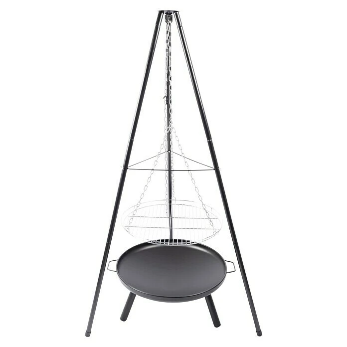 Der RedFire Schwenkgrill El Paso enthält neben dem Gestell mit dem Rost auch die dazu passende Feuerschale. So lässt sich das Grillvergnügen direkt nach dem Aufbau starten. Dazu wird das Gestell einfach über die Feuerschale gestellt und schon kann es losgehen. Feuerschale und Gestell sind aus pulverbeschichtetem Stahl gefertigt, das Rost besteht aus verchromtem Stahl und lässt sich mit der Kette in der Höhe regulieren. Durch das Gestell ist zudem Flexibilität gegeben, da es zusammen gesteckt wird und somit der Auf- und Abbau schnell erledigt ist. Zudem ist das Packmaß dadurch sehr gering, sodass es auch gut unterwegs an einer Lagerfeuerstelle genutzt werden kann.