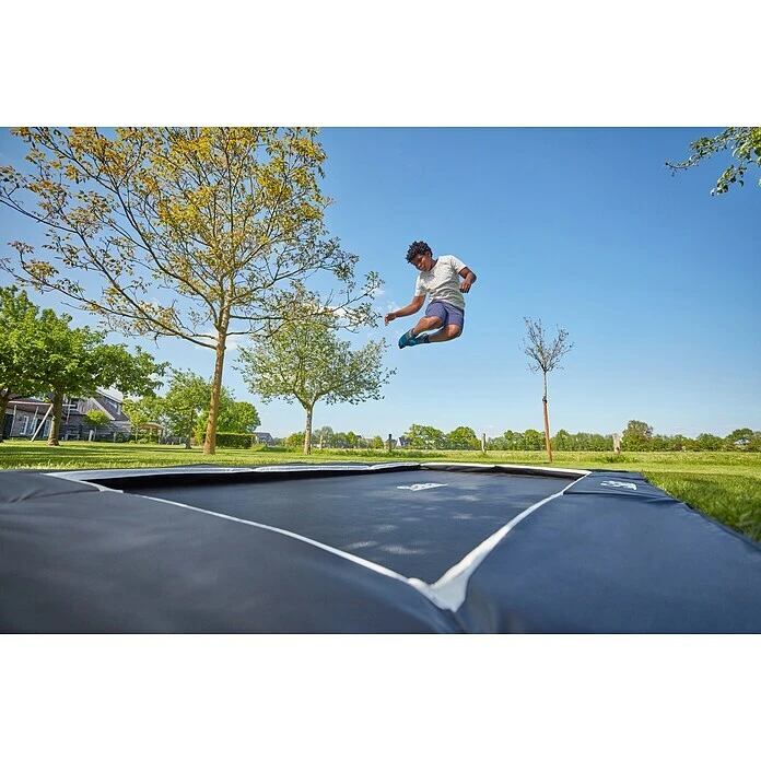Das Salta Royal Baseground ist ein besonders innovatives Trampolin von erstklassiger Qualität, das sich auf gleicher Höhe mit dem Rasen befindet. Dadurch ist das Trampolin vollständig in deinen Garten integrierbar! Das Royal Baseground unterscheidet sich durch das speziell entwickelte und patentierte ‘Air Performance System’. Dieses Ventilationssystem gewährleistet einen ausreichenden Abstand zwischen der Sprungmatte und dem Schutzrand, was zu einer guten Luftzirkulation führt. Die Außenseite besteht aus einer robusten Paneel Verkleidung, die für ein sicheres Fundament sorgt. Der langlebige und standfeste Rahmen ist doppelt verzinkt und zur Vermeidung von Korrosion mit einer schwarzen Pulverbeschichtung versehen. Der schwarze Schutzrand besteht aus robustem und hochwertigem PVC Material. Aufgrund des praktischen Netzsystems, das am Schutzpolster angebracht ist, ist es für Kinder unmöglich mit den Federn in Berührung zu kommen.