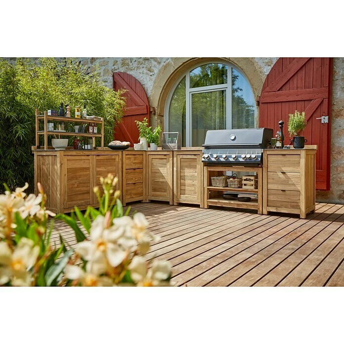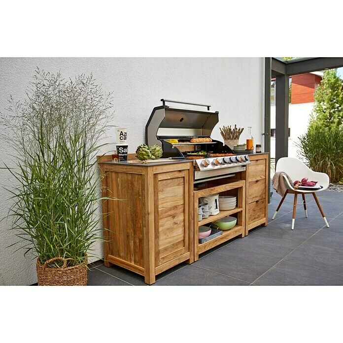 Mit den Zoe Teak Grillküchen-Modulen kann eine individuelle Outdoor-Küche zusammengestellt werden, welche durch verschiedene Kombinationen ideal an die Gegebenheiten auf der eigenen Terrasse oder im heimischen Garten angepasst werden kann.