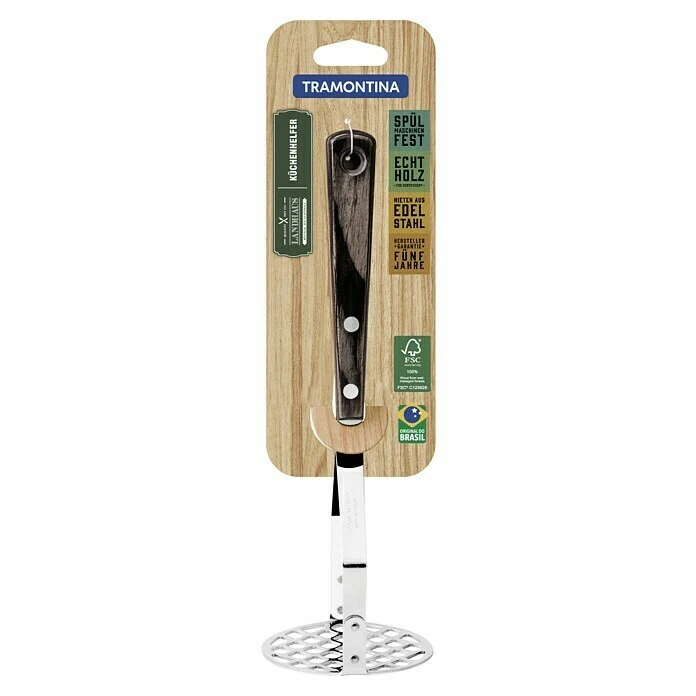 Mit dem Tramontina Landhaus Kartoffelstampfer holen Sie sich einen Küchenhelfer in die Küche, der aus langlebigem Edelstahl gefertigt ist. Sein Holzgriff besteht aus imprägniertem Kiefernholz, sodass der Stampfer in der Spülmaschine gereinigt werden kann.