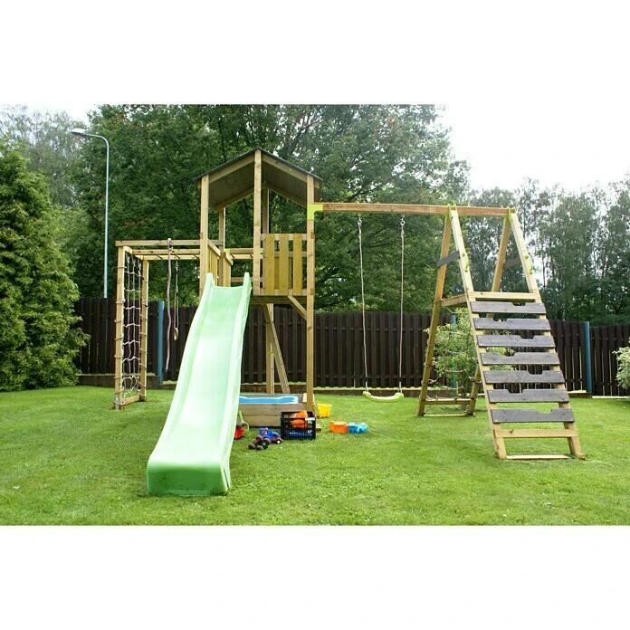 Der Wendi Toys Spielplatz Dino mit vielen Extras bietet optimalen Spielplatz für Kinder zwischen 5 und 12 Jahren. Die Fertigung aus hochwertigem Fichtenholz verleiht jedem Spielplatz ein besonderes Flair und sorgt darüber hinaus für eine hohe Stabilität und Sicherheit. Ein guter Schutz gegen Witterungseinflüsse wird durch die Imprägnierung des Holzes gewährt. Zusätzliche Sicherheit für die spielenden Kinder wird durch abgerundete Kanten geboten. Durch farbigen Zierelemente wird der Spielplatz optisch aufgewertet. Die umfangreiche Ausstattung bietet viel Platz zum Toben und genügend Rückzugsmöglichkeiten. Der Sandkasten unterhalb der Veranda, die 295 cm lange Rutsche, das Klettergerüst mit Turnringen, Kletterseil und –netz sowie die Doppelschaukel mit Klettertreppe sorgen für abwechslungsreiche Spielmöglichkeiten. Alles was Kinder zum Spielen brauchen wird mit diesem Spielplatz auf einer Fläche von 25 m² geboten. Der Spielplatz wird in sieben getrennten Kisten geliefert, wodurch der Aufbau einfach Schritt für Schritt durchgeführt werden kann.