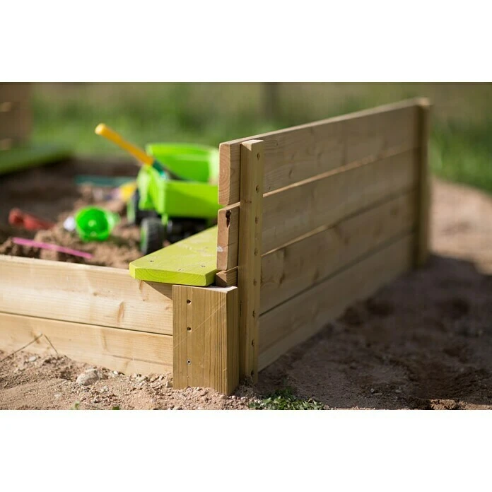 Der Wendi Toys Sandkasten Deluxe bietet optimalen Spielspaß für Kinder in allen Altersklassen und stellt die ideale Erweiterung für den Spielplatz im eigenen Garten dar. Die Fertigung aus hochwertigem Fichtenholz verleiht dem Sandkasten ein besonderes Flair und sorgt darüber hinaus für eine hohe Stabilität und Sicherheit. Ein guter Schutz gegen Witterungseinflüsse wird durch die Imprägnierung des Holzes gewährt. Kinder können in der kompakten Sandgrube Spielburgen und Sandschlösser bauen und ihrer Fantasie freien Lauf lassen. Der Lieferumfang beinhaltet Holzabdeckungen, die den Sand vor Regen und Laub schützen und während der Benutzung des Sandkastens als Sitzlehne genutzt werden können.