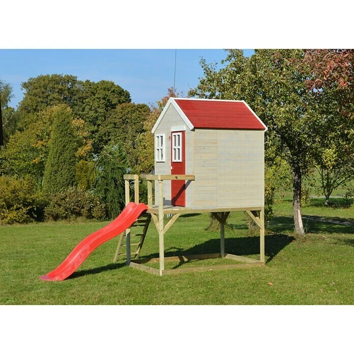 Das Wendi Toys Spielhaus Tiger bietet optimalen Spielspaß für Kinder zwischen 3 und 7 Jahren. Die Fertigung aus hochwertigem Fichtenholz verleiht jedem Spielhaus ein besonderes Flair und sorgt darüber hinaus für eine hohe Stabilität und Sicherheit. Ein guter Schutz gegen Witterungseinflüsse wird durch die Imprägnierung des Holzes gewährt. Zusätzliche Sicherheit für die spielenden Kinder wird durch abgerundete Kanten geboten. Durch die vielen verspielten und modernen Details wird das Spielhaus optisch aufgewertet. Das Haus auf Stelzen bietet viel Platz zum Toben und genügend Rückzugsmöglichkeiten und ist damit der ideale Ort, an dem Kinder ihrer Fantasie freien Lauf lassen können. Ein hoher Tageslichteinfall wird durch die zwei Fenster sowie der Tür mit eingebautem Fenster gewährt. Der rote Fensterladen bietet dabei Schutz vor direkter Sonneneinstrahlung. Auf einer Höhe von 90 cm befindet sich die angeschlossene Veranda. Das Spielhaus wird in fünf getrennten Kisten geliefert, wodurch der Aufbau einfach Schritt für Schritt durchgeführt werden kann.