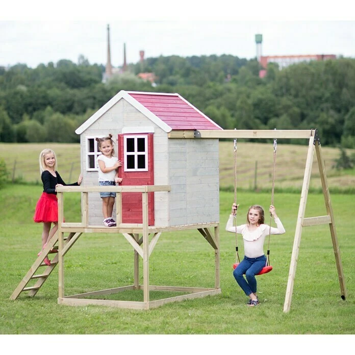 Das Wendi Toys Spielhaus Zebra bietet optimalen Spielspaß für Kinder zwischen 3 und 7 Jahren. Die Fertigung aus hochwertigem Fichtenholz verleiht jedem Spielhaus ein besonderes Flair und sorgt darüber hinaus für eine hohe Stabilität und Sicherheit. Ein guter Schutz gegen Witterungseinflüsse wird durch die Imprägnierung des Holzes gewährt. Zusätzliche Sicherheit für die spielenden Kinder wird durch abgerundete Kanten geboten. Durch die vielen verspielten und modernen Details wird das Spielhaus optisch aufgewertet. Das Haus auf Stelzen bietet viel Platz zum Toben und genügend Rückzugsmöglichkeiten und ist damit der ideale Ort, an dem Kinder ihrer Fantasie freien Lauf lassen können. Ein hoher Tageslichteinfall wird durch die zwei Fenster sowie der Tür mit eingebautem Fenster gewährt. Der rote Fensterladen bietet dabei Schutz vor direkter Sonneneinstrahlung. Zu dem Spielhaus gehört außerdem eine 90 cm hohe Veranda sowie ein Schaukelgerüst. Das Spielhaus wird in fünf getrennten Kisten geliefert, wodurch der Aufbau einfach Schritt für Schritt durchgeführt werden kann.